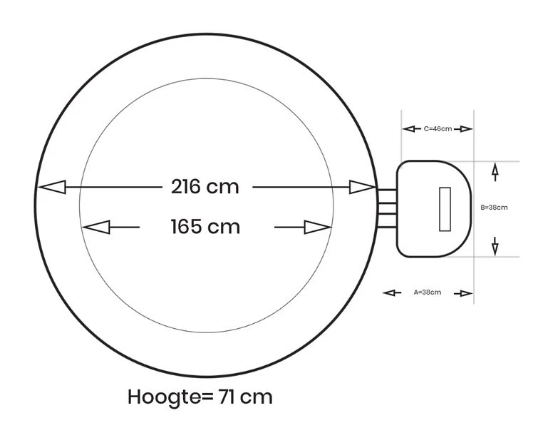 Let op: Om de Intex Pure Spa Greywood Deluxe volledig (inclusief motorblok van 38x46x38 cm) te kunnen plaatsen, adviseren wij een minimale (tuin)ruimte van 300 bij 220 cm. De kabel is 3,5 meter lang, dus zorg dat er binnen deze lengte een stroomvoorziening aanwezig is.