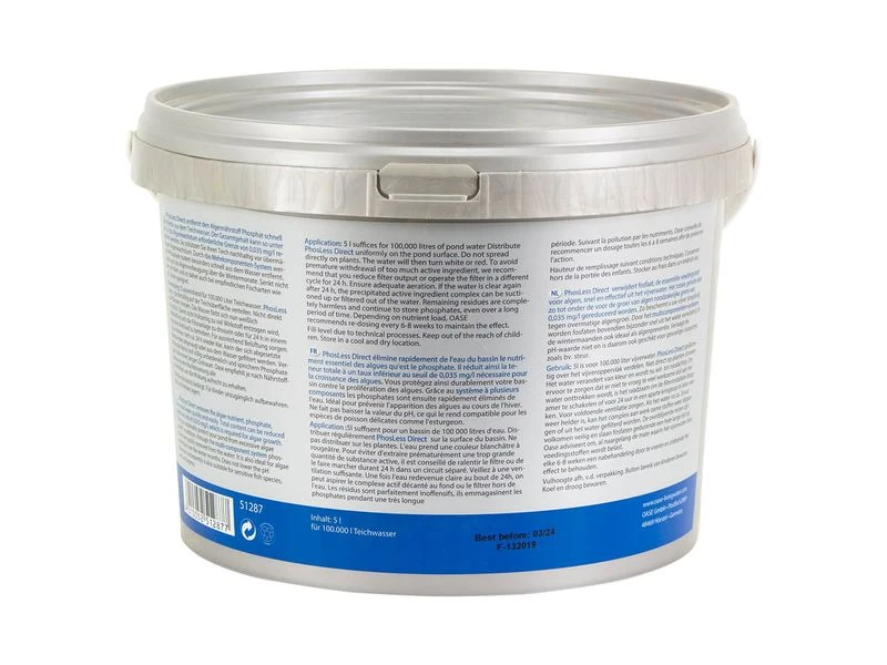Fosfaten komen in tuinvijvers naar verhouding voor in kleine hoeveelheden, maar ze vormen een belangrijke voedingsbron voor algen en schadelijke bacterien. Phosless Direct onttrekt fosfaat op fysische wijze aan water zodat algenplagen effectief kunnen worden voorkomen. Het biedt ook snelle hulp bij acuut verhoogde fosfaatwaarden en direct na algenbehandelingen. Oase Phosless Direct brengt het fosfaatgehalte onder de grens van 0,035mg/l zodat algen niet meer kunnen groeien. Dit product is idealiter te gebruiken in het vroege voorjaar om algenplagen in het vijverseizoen te voorkomen.