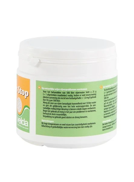 Phos Stop werkt doeltreffend tegen zowel draad- en slijmalgen als zweefalgen (groen water) in de vijver. Fosfaat is een belangrijke voedingsstof voor algen. Dit product bindt fosfaat waardoor algengroei wordt voorkomen. Dit product is veilig voor alle flora en fauna in de vijver. Het is aan te raden om voor gebruik de kwaliteit van het vijverwater te controleren en de waterhardheid eventueel op peil te brengen met GH Plus.