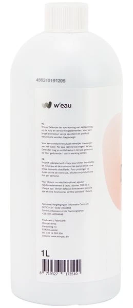 Met W’eau Defender voorkom je de opbouw en afzetting van kalkaanslag op het spa-oppervlak en de inbouwdelen. W’eau Defender is een goede ontkalker die niet alleen bruikbaar is voor het voorkomen van, maar ook voor het verwijderen van kalkaanslag. Het verlengt de levensduur van je leidingwerk en alle apparatuur in je spa.